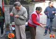 Hutongs are streets in Beijing that are packed with communal-style housing developments. Though the space is limited, families usually have enough. Here, two hutong residents demonstrate exercises with Chinese yo-yos in their courtyard.