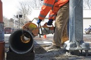 A worker cuts an old stoplight pole into manageable pieces at the intersection of Massachusetts Ave. and Amherst St. around noon on Friday, March 21. The worker said that old stoplight poles up and down Massachusetts Ave., such as the one pictured, are being replaced by new ones.