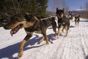Spencher G. Ahrens G, Eva K. Markiewicz, and Muddy Paw Sled Dog Kennel manager Neil Beaulieu mush a team of sled dogs along a trail in the White Mountains in New Hampshire on Sunday, March 23.