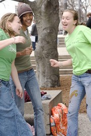 (from left) Priscilla W. Army ’10, Amber R. Lin ’11, and Eleanor H. Mallory ’11 dance to the beat of the Pantonic Steel Orchestra outside the Student Center last Friday.