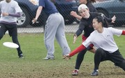 Karen K. Shu G throws a pass past a Northeastern defender to Adele D. Phillips G to score the final goal of the match. sMITe, the MIT women’s ultimate team, played a scrimmage against the Northeastern Valkyries this past Sunday evening, which they won 5-3.