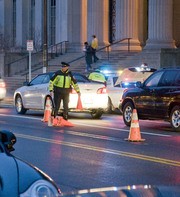 The stoplights and streetlights have periodically been out at the 77 Massachusetts Ave. crosswalk during recent evenings. Shown is an officer directing traffic in lieu of the traffic signal.