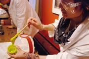 Brooke A. Jarrett ’10 of Team Magenta demonstrates the edible creations made with her group’s “Chem Cookin’” set to children at 2.00b Toy Product Design’s test evening at the MIT Museum on Monday.