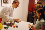 John M. Walton ’11 of Team Ochre shows a girl his “Cool Pool” set of modified pool balls at 2.00b Toy Product Design’s test evening at the MIT Museum on Monday.
