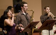 The so-called 7:30 and 5:30 Jazz Combos played a joint end-of-semester concert last Tuesday, April 29 in Killian Hall. Here, Sheena C. Hembrador ’06 belts out the vocals in Stevie Wonder’s “Superstition” as (left to right) ensemble coach A. Keala Kaumeheiwa (obscured) plays electric guitar, Daniel R. Hochbaum ’10 plays saxophone, and Aaron J. Schmidt G plays trumpet.