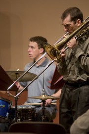 The so-called 7:30 and 5:30 Jazz Combos played a joint end-of-semester concert last Tuesday, April 29 in Killian Hall. Here, Kenneth McEnaney G (right) and Steven A. Chait G of the 7:30 Combo play the trombone and the drums in John Coltrane’s “Mr. P.C.”