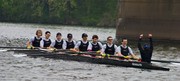 Coxswain Maria J. Telleria ’08 raises her hands in triumph as the men’s lightweight crew team recovers after a race against the University of Pennsylvania on Saturday.