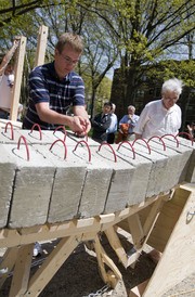 David S. Baumgartner ’08 removes blocks as Professor Herbert H. Einstein looks on after the bridge designed by his team failed to support the 2000 lbs it was intended to hold. The event took place outside of student center on May 7 as part of Senior Civil and Environmental Engineering Design (1.013).