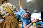 Gregory D. Tao ’10, winner of the 2.007 robotics competition “Da(yes)MIT,” is carried on a victory lap by Utilikilt-wearing Professor Alexander H. Slocum, last night in the Johnson Athletic Center.