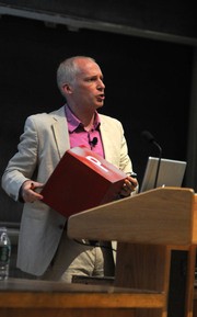 Marcus du Sautoy presents a large die with a single prime number P on it. Sautoy used the prop to help explain the prime number theorem, which describes the density of the primes, in a lecture entitled “The Music of the Primes.”