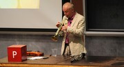 Oxford mathematician Marcus du Sautoy plays Charlie Parker’s “Yardbird Suite” on trumpet as a fun, yet appropriate diversion in a lecture entitled “The Music of the Primes,” held yesterday evening in 26-100.