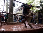 Javier M. Duarte ’10 throws Cinjon T. Resnick ’10 while mud wrestling at Steer Roast 2008 on April 2. Steer Roast is Senior Haus’ annual weekend long party that started at 5 p.m. on Friday, May 2 with the lighting of the fire pit and traditional mud wrestling (featuring Haus housemasters Henry and Cynthia Jenkins) and continued until well past the bands finished playing late Saturday night.
