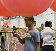 Ritchie D. Nicholson ’11 holds his team’s project during the 16.00 (Introduction to Aerospace and Design) class flyoff for lighter-than-air vehicles at Johnson Athletics Center on Friday, May 13.