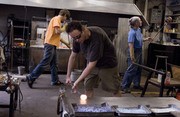 Brendon Edwards rolls molten glass that will become the body of a pumpkin over a metal plate called a marver.