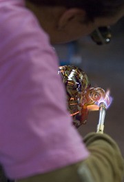 Michelle M. McGuire secures the stem of a glass pumpkin to its base using a blow torch.