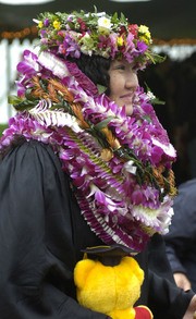 Hawaiian Sarah P. Kama ’08 is decorated by her family in flowers at the Commencement reception area on Kresge Oval. This year’s Commencement ceremony was held June 6.