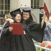 Helen H. Liang ’08 (left) and Wendi Li ’08 celebrate as they walk down off the stage after receiving their undergraduate degrees in Electrical Engineering and Computer Science. This year’s Commencement ceremony was held June 6 on Killian Court.