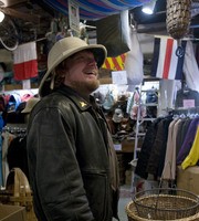 Pilot Andreas Mershin tries on an African Safari hat at Marine Specialties Inc. in Provincetown, Mass. The store specializes in military surplus and has a large collection of specialty hats and uniforms.