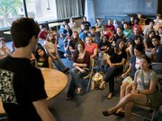 Burton-Conner House’s head rooming chair James Torres ’10 addresses the dorm’s freshmen before the start of floor rush in the Porter Room of Burton-Conner on Wednesday evening.