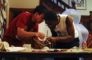 Qiaochu Yuan ’12 and Christopher S. Brathwaite ’12 build a model of buckminsterfullerene from gumdrops and skewers at TEP on Sept. 2 during rush.