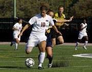 Midfielder Lauren R. Hernley ’11 holds off Allie Megna of Simmons College in Wednesday’s non-conference match. The MIT Engineers won 1-0.