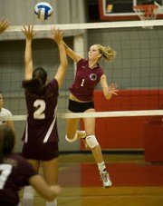 Kelly E. Schulte ’12 leaps up for a kill in front of a Rhode Island College player in the pre-season game on Wednesday, Sept. 3.