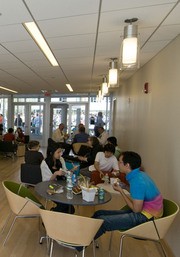The MIT community enjoys lunch inside one of the new community lounges in the New Ashdown during the community picnic on Sept. 8.