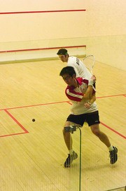 MIT’s top-ranked squash player Andrew Yoon ’10 returns a deep shot against Brown University’s Adam Greenberg on Tuesday evening. Yoon lost his match 3-1 as Brown went on to defeat the Engineers 9-0.