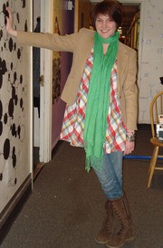 Tess E. Wise ’10 is wearing her grandmother’s jacket, a scarf from a street vendor in Brussels ($5), boots from Riverwoods ($70), a plaid dress from H&M ($15), jeans from TJ Maxx ($30), and bracelets from Bass ($10). Why we like it: The layering and weather-friendly shoes make this a practical outfit, while the bold prints and colors are eye-catching.