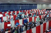 Students crowd around company booths at the MIT Career Fair, which was held in Johnson Athletic Center yesterday.