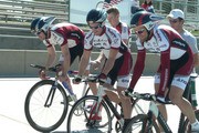 The MIT men’s cycling team composed of Jason A. Sears G, Anthony J. Schrauth G, and Michael L. Garrett G take off from the line at the Collegiate Track Nationals.