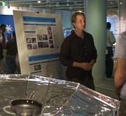 Scot G. Frank ’09 (also a Tech photographer) shows off the solar concentrator he helped develop at the Innovation Night at the MIT Museum on Sept. 12.