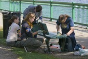 Members of the service fraternity Alpha Phi Omega paint a bench on the bank of the Charles River as part of the Smoot 50th Anniversary Celebration on Saturday afternoon.