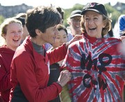 MIT President Susan J. Hockfield is presented with a tie-dye style T-shirt from members of the crew team as part of the Crew Alumni Association’s boat dedication at the Boathouse on Saturday morning.