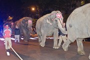 Elephants from the Ringling Bros. and Barnum & Bailey Circus walk down Massachusetts Ave. past Building 1 on Monday evening. The elephants, along with other circus animals, were being transported from train cars behind Simmons Hall to the TD Banknorth Garden.