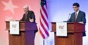 Former Director of the C.I.A. R. James Woolsey (left) and executive director of the National Commission on Energy Policy Jason Grumet debate energy policy as campaign surrogates for U.S. Presidential candidates John McCain and Barack Obama (respectively) at Kresge Auditorium on Monday evening.