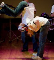 Zeta Psi brothers Manuel Cabral ’12 (top) and Conor R. O’Rourke ’11 perform a flip during Sigma Kappa’s Late Night in Kresge on Saturday evening.
