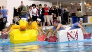 Team “Just Ducky” members (left to right) Sarah C. Wilder ’10, Zachary Bjornson-Hooper ’10, and Elizabeth A. Hass ’10 race against team “Tipsy” members Rahul Kar G and Santolina Savannet G in the Head of the Zesiger cardboard boat competition this past Friday, Oct. 10.