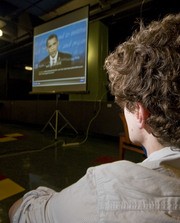 Bryan L. Newbold ’09 watches a screening of the third presidential debate on Wednesday evening in the Coffeehouse of the Stratton Student Center. The screening of the debate was a joint presentation of the MIT Forum on American Progress, Current.com, and the Student Activities Office, and featured live commentary from users of Twitter, an internet blogging service.