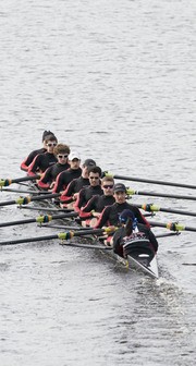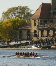 The Varsity Women’s Openweight Rowing team races past Radcliffe’s Weld Boathouse, halfway through the 44th Head of the Charles Regatta. The team rowed in the Championship eight division, which took place on Oct. 19. The boat finished 31 out of 38 entries, covering the 3.2 mile race course with a time of 17:50:703. (right to left) Celena Chan ’12 coxed the rowers, including stroke Tess Saxton-Fox ’12, Leslie Sprague ’09, Catherine Crowley ’12, Megan O’Donnell ’12, Jane Wolcott ’09, Ariana Chehrazi ’12, Genevieve Russo ’09, and Inessa Liskovich ’09.