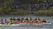 The Varsity Men’s Heavyweight Rowing team (red boat) clashes oars with the University of Washington’s rowers after passing under Weeks Footbridge in Sunday’s Championship eight division of the Head of the Charles. Stephen F. Young ’09 coxed the men, (right to left) stroke Luke S. Urban ’09, Rane Nolan ’09, Thomas A. Larsen ’09, Steven A. Wesel ’12, Christopher M. Jones ’12, Alessandro Chiesa ’09, David Janicek ’09, and Lucas Goodman ’10. Their boat finished 16 out of 37 with an official time of 15:13:958.