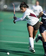 Nirupama Yechoor ’11 aims for a pass past Smith College defenders on Saturday, Oct 18. A late goal pushed Smith College to a 2-1 victory during double overtime.