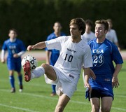 Christian W. Therkelsen ’11 takes control of the soccer ball from the U.S. Coast Guard Academy. MIT triumphed 2-1 for their first victory over the Academy since 2004.