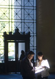 Parents Niranjan Kumar and Nita Kumar read in Lobby 7 on Oct. 17, the first day of Family Weekend at MIT. Family Weekend lasted 3 days and welcomed family members of current students with several fun events including the Nobel Laureate luncheon, an a cappella concert, and several informational panels.