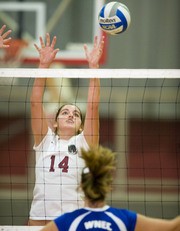 Alexandra T. May ’10 reaches for a block against Western New England College on Saturday, Oct. 18. MIT claimed first place in the Quad Tournament with victories over Western New England and Saint Mary’s Colleges.