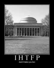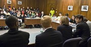 (foreground, from left) Undergraduate Association Senate Speaker Jason C. Forte ’09, Vice President for Institute Affairs and Secretary of the MIT Corporation Kirk D. Kolenbrander, President Susan J. Hockfield, and UA President Noah S. Jessop ’09 address a packed UA Senate meeting on Monday evening in W20-400.