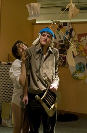 The Phantom of the Football Player, played by Ari Daniel Shapiro G, advises the woman played by Mia A. Shandell ’10 in “Menfolks and the Woman” running from Nov. 13-15 at 8 p.m. in the Wiesner Student Gallery. This theater arts workshop is a Hungarian satire by Milan Fust translated and directed by Istvan Cziegler.