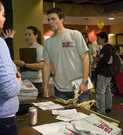 Nikolai D. Begg ’09 learns about the Senior Gift during the opening ceremony on Nov. 13 in the Coffeehouse. The Class of 2009’s gift will be a donation to MIT’s OpenCourseWare. The money will be used to update the course material for 5.111, a freshmen chemistry course.