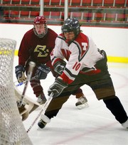 Forward Nicholas R. LaBounty ’09 crashes the net against Boston College in Johnson Ice Rink on Wednesday. LaBounty’s second period goal gave them a brief 2-1 lead, but MIT went on to lose 4-2.