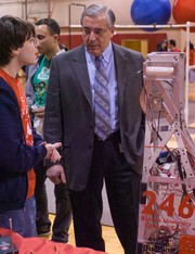 Boston University Academy high school student Craig Broady (left) speaks with Kenneth F. Colucci, head of Strategic Relations at the MIT Lincoln Laboratory, on Tuesday at BUA. Students built robots as part of the For Inspiration and Recognition of Science and Technology (FIRST) Robotics Competition, which will be held Mar. 27-29 at Boston University.
